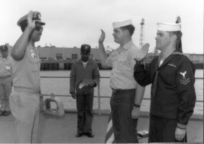 | Carl reenlists in the Navy for another four years. The ceremony is held on the forecastle of a barge in Long Beach Harbor that the crew uses on duty days. Reenlisting with him is Terry Drysdale. |